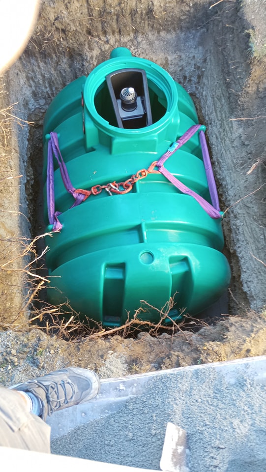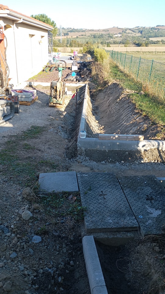 Chantier secteur Cournon d’Auvergne. Mise en place d’une cuve de récupération d’eau de pluie de 3000L. Terrassement d’un garage …