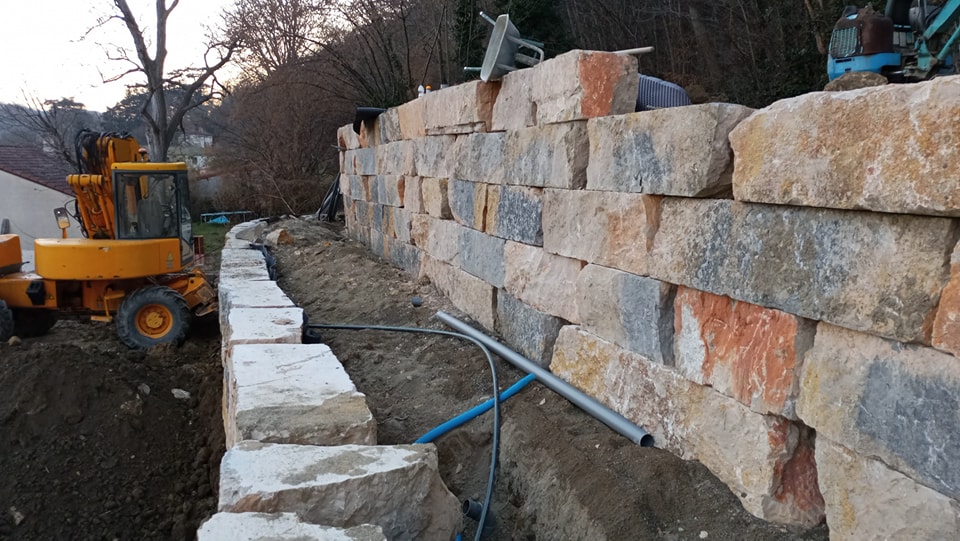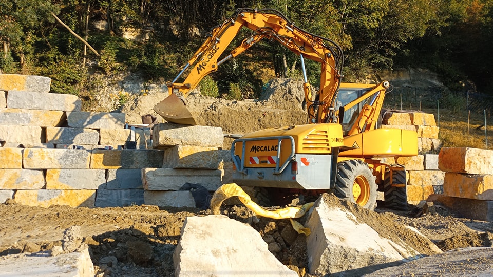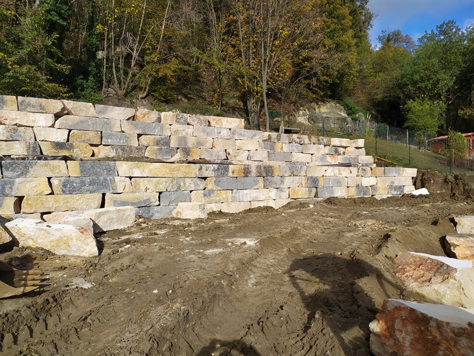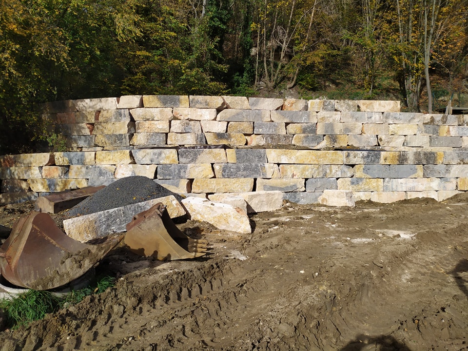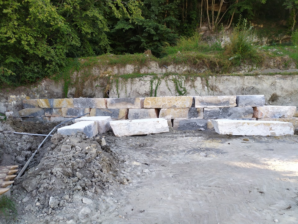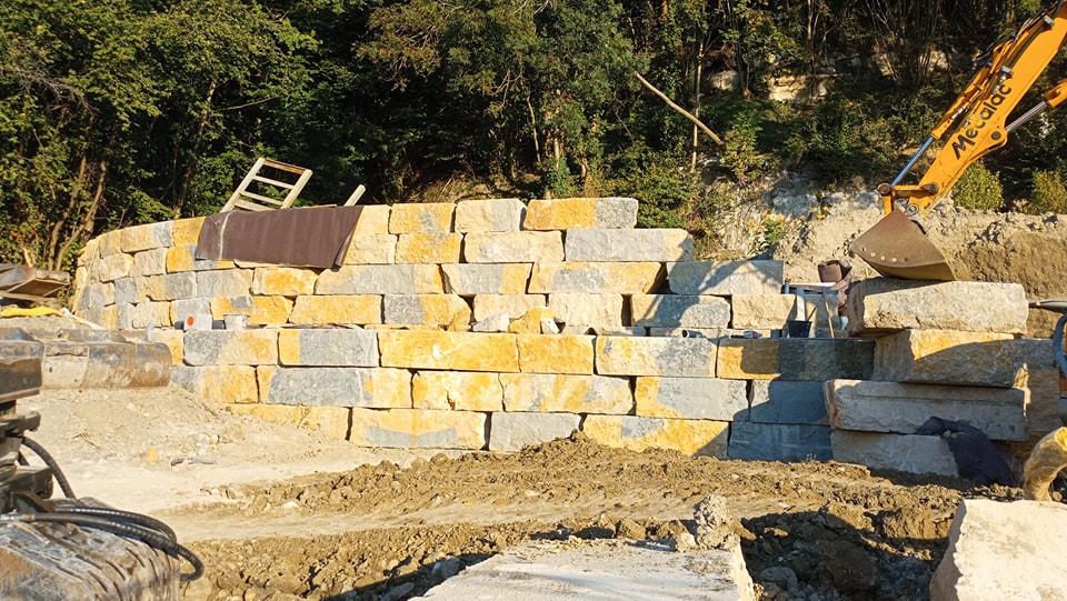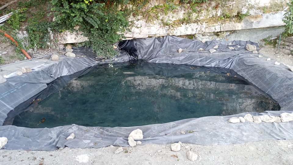 Chantier sur le secteur de Coudes (63). Mise en place de blocs de pierre provenant de la carrière Bonicel, avec de nombreux drains derrière chaque rangées afin d’évacuer l’eau souterraine des alentours. La marre située au dessus de l’ensemble a été étanchéifié à l’aide d’une bâche EPDM.