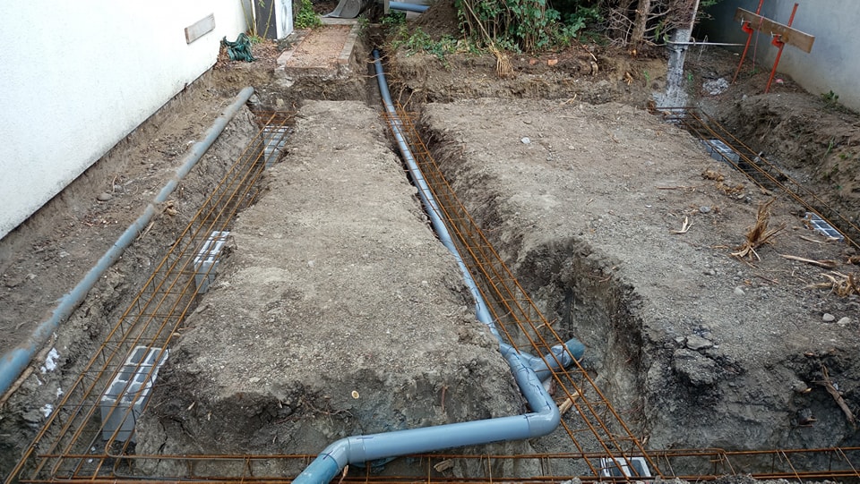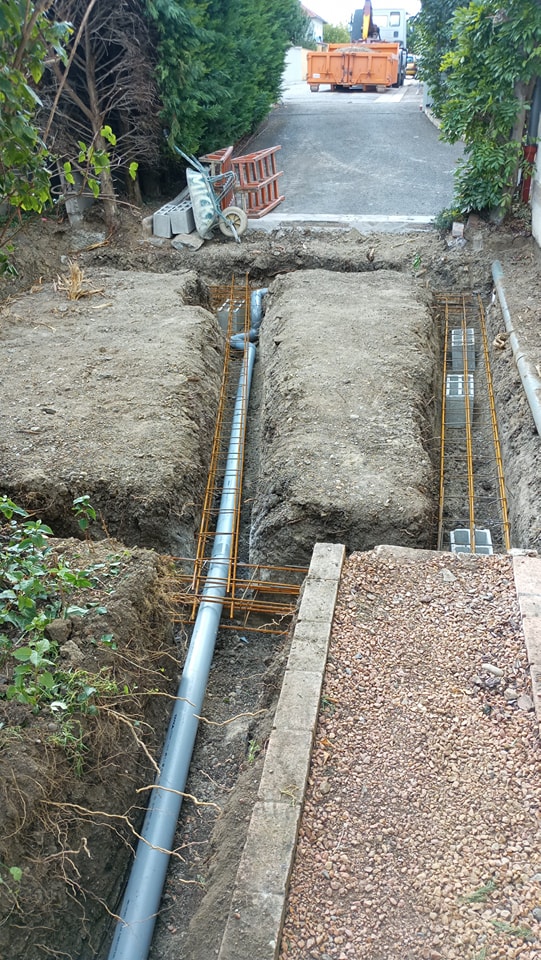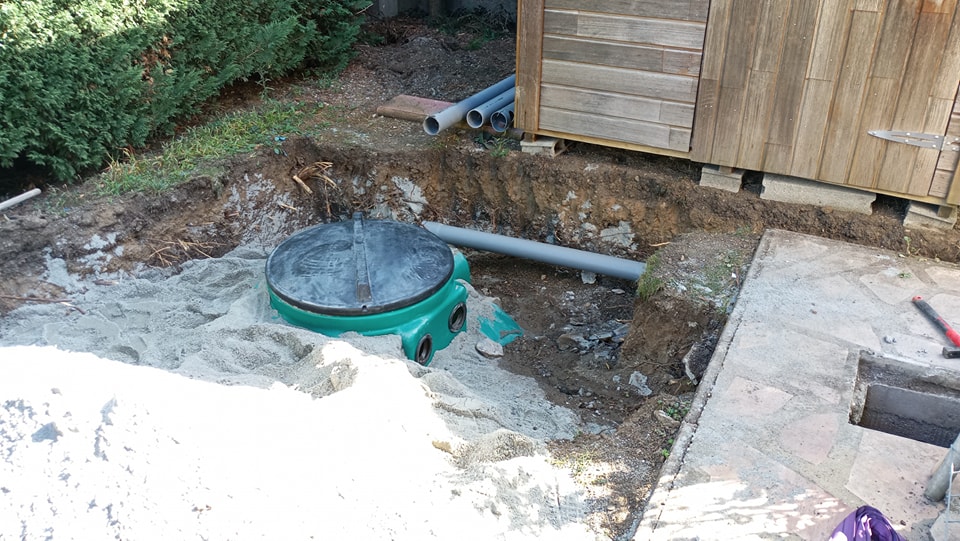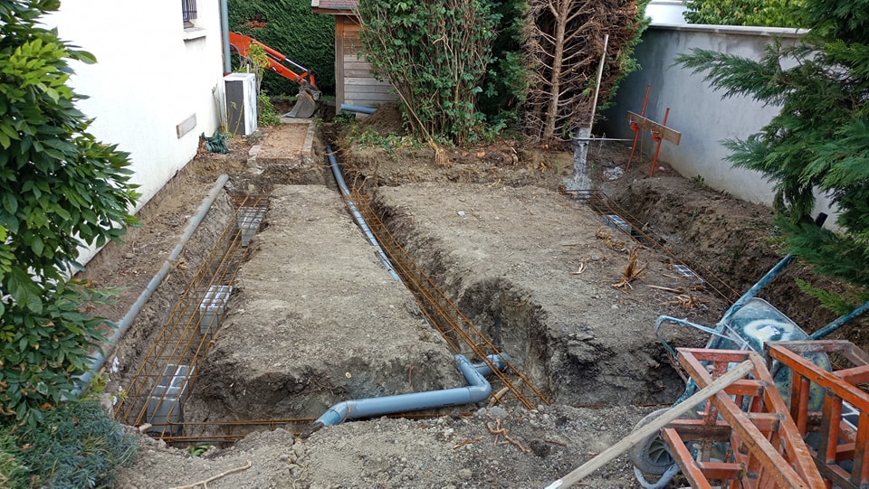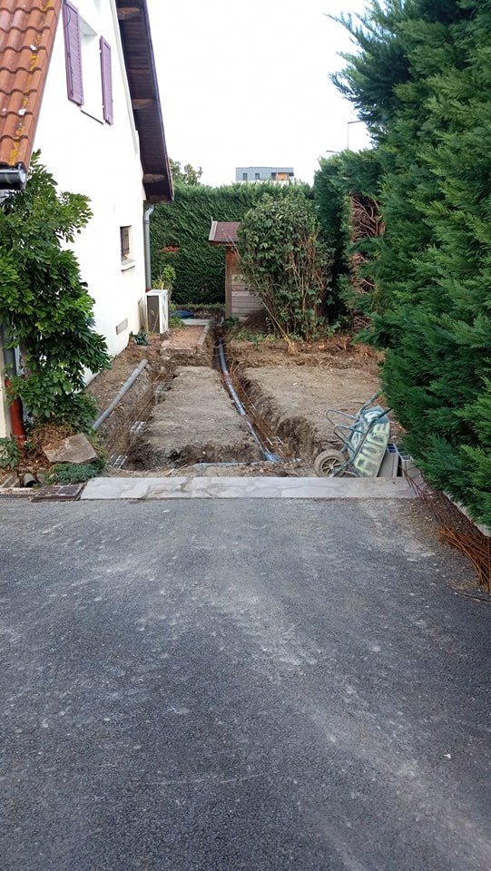 Chantier secteur Cournon d’Auvergne. Mise en place d’une cuve de récupération d’eau de pluie de 3000L. Terrassement d’un garage extérieur.